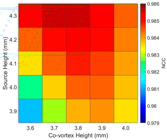 Figure 18, we found that the NCC seems higher around the top left-hand corner, which corresponds to a co-vortex height of 3.7 mm and source height of 4.3 mm, but this result disagrees with the results found in