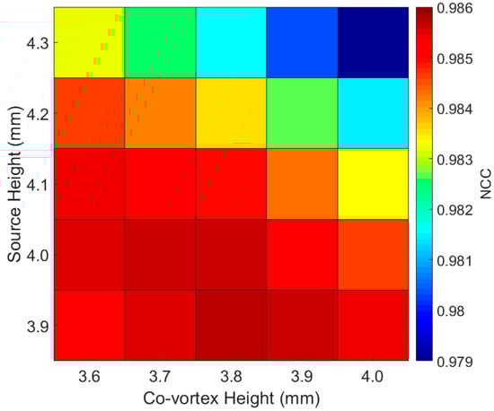 Values used in the two-way regression are 3.9–4.3 mm with 0.1 mm increments for the source height, and 3.6–4.0 mm with 0.1 mm increments for the co-vertex height. The values were then meshed into a matrix of 5 × 5, to a total of 25 combinations, and their NCCs were calculated. The graph of NCCs for the distance most important in this study, 10 mm, is shown in