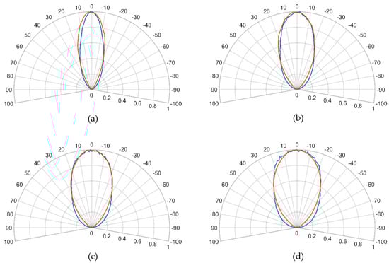 LED pair LED 1 and LED 3 were chosen to be the representative angular intensity distribution due to their high NCC values with small standard deviation across all the distances, where all the NCC values were above 99% and the NCC did not vary much across the distances. The representative angular intensity distributions compared with the final simulation results at selected measuring distances are shown in Figure 21.