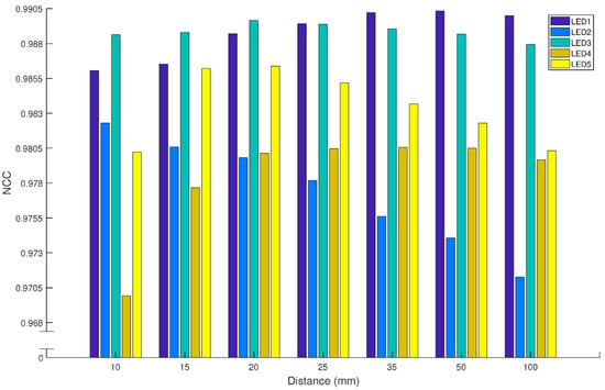 Figure 7, the NCCs averaged over the LED pairs at seven measuring distances are also similar, emphasizing that our measurement system is accurate across the distances. Since we are mainly using the measurements to model a through-hole LED to be used in an optical element design close to the LED, we care mostly about the midfield region. Hence, we also made sure that the LED pairs at 10 mm have good correlation, which all the NCCs are over 98%.