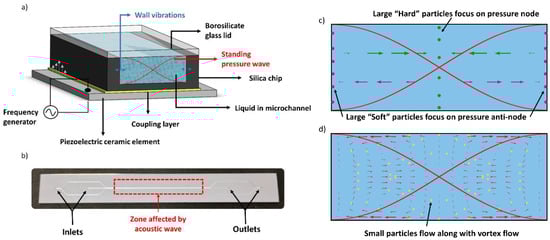 (a) Schematic representation of an acoustofluidic channel: A piezoceramic element is vibrating at 1.93 MHz. Vibrations are transferred to the channel wall, creating a standing pressure wave. (b) Picture of an acoustofluidic chip, showing two inlets and two outlets together with the acoustic zone. (c) The behavior of large particles (>2 µm) in an acoustofluidic device. “Hard” particles focus on the pressure node while “soft” particles focus on the pressure antinodes. (d) The behavior of small particles (<2 µm) in an acoustofluidic device.