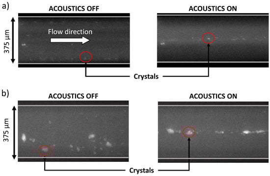 The radiation force drives material with a positive contrast factor towards the pressure node of a standing pressure wave according to Equation (1). Rising the local density of crystals or high-density droplets by focusing them in a specific location increases the signal to noise ratio significantly. This facilitates the detection and could enable easier characterization of the material of interest. This is especially of relevance in current serial crystallography experiments where a thin jet is brought in the X-ray beam. Focusing of miconazole and lysozyme microcrystals is shown in Figure 2. Miconazole nitrate crystals were grown in the microfluidic channel until an average size of 15 ± 3 µm (n = 17) and focused rapidly upon activation of the acoustic field (Figure 2a, Supplementary Materials: Video S1). At an applied voltage of 10 Vp-p, the crystals reach their equilibrium position in 1.28 seconds. Note that the radiation velocity can be increased by raising the applied voltage [28]. Moreover, the obtained crystal morphology was significantly different compared to crystals grown in batch. In the microfluidic reactor, small needle-like crystals were observed in contrast with a sea urchin morphology (aggregation of needles) obtained in batch.