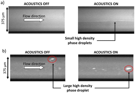 Focusing of high-density droplets. Upon activation of the acoustic field, droplets are focused in the center of the microfluidic channel, with a driving voltage of 25 Vp-p. (a) Focusing of small droplets in the center of the channel, (b) focusing of large droplets.
