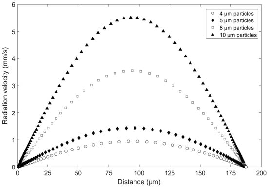 As mentioned above, the radiation force and related radiation velocity strongly depend on the particle size (Equation (1)), allowing the separation of particles or crystals based on their size. To gain more insight in typical time and velocity values related to these phenomena, numerical simulations were performed to calculate the radiation force on polystyrene particles in water. The effect of the particle diameter on the radiation velocity was investigated as well. The size dependency of the radiation force is shown in Figure 4. As expected, the largest particles (10 µm) have the highest radiation velocity (5.5 mm/s maximum) and the smallest particles (4 µm) a low radiation velocity (0.9 mm/s maximum). Particles of 4 µm and 5 µm have a velocity difference of 0.5 mm/s. This difference in radiation velocity is sufficient to separate a particle mixture in different streams, each containing one particle size. It should be noted that the radiation velocity is not constant over the width of the channel. A decrease in velocity is observed closer to the node, which is in agreement with Equation (1).