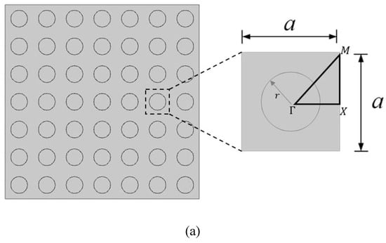 where is the displacement vector, is the natural frequency, is the position vector, is the wave vector in the first Brillouin zone, and is the periodic vector function of , respectively. The phononic crystal lattice and have the same periodicity. The wave propagation in the periodic structure can be solved by using Equations (1) and (2). In this paper, the solution procedures are done by the finite element method. The boundary conditions of the unit cell is: