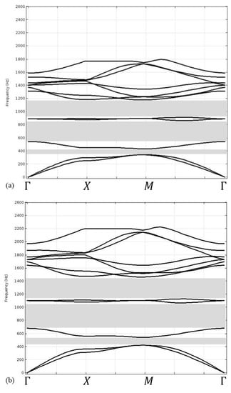 - Sigalas, M. Elastic Wave Band Gaps and Defect States in Two-dimensional Composites. J. Acous. Soc. Am. 1997, 101, 1256. [Google Scholar] [CrossRef]