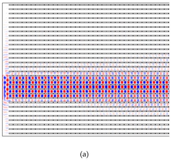 The displacement field simulations of the wave propagation in phononic crystals composed of star-shaped honeycomb and rectangular inclusions for (a) , (b) and (c) . The star angle of the matrix is and the dimensions of the rectangular inclusions are , .