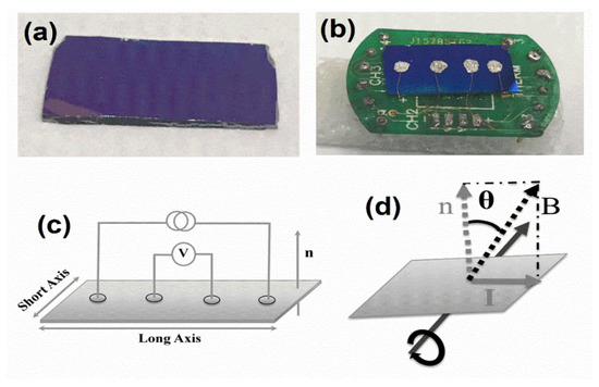 (a) Sample image of the grown film; (b) stage for the MR measurement; (c) schematic for the 4-probe measurement and (d) angular MR measurement.