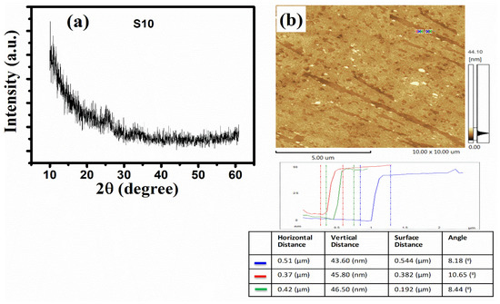 The average thickness of the sample thin film was measured at around ~44 nm by atomic force microscopy, as shown in Figure 3b. The π and π* band was raised up due to the nanometer-sized graphitic rings which have a tendency to exist as sp2 hybridized carbon atoms, whereas the aliphatic chains are due to the existence of the sp3 hybridized carbons. The D-band corresponds to the breathing mode of A1g symmetry in the six atoms ring, which is due to the defects, which are needed for its activation; consequently, this band is foremost in the presence of the defects and was not present in the case of graphene [10,28]. The in-plan distending gesture of the carbon atom pairs present in both the ring and chain shapes gives rise to the Raman G-band. Moreover, the XRD pattern shown in Figure 3a also shows evidence of the completely amorphous nature of the prepared sample a-carbon thin film.