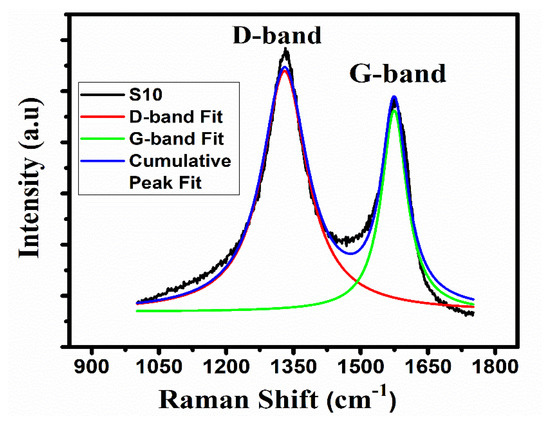 The Raman spectrum of the disordered sample a-carbon thin films is shown in Figure 4, which presents the two major Raman bands as G-band and D-band, positioned at~1574 cm−1 and ~1330 cm−1, respectively. The ID/IG is known as the D-band and G-band intensity ratio, which presents evidence of C(sp2) content in the thin film specimen. The magnitude of the ID/IG intensity ratio was found to be 2.11 in this sample.
