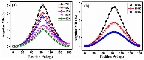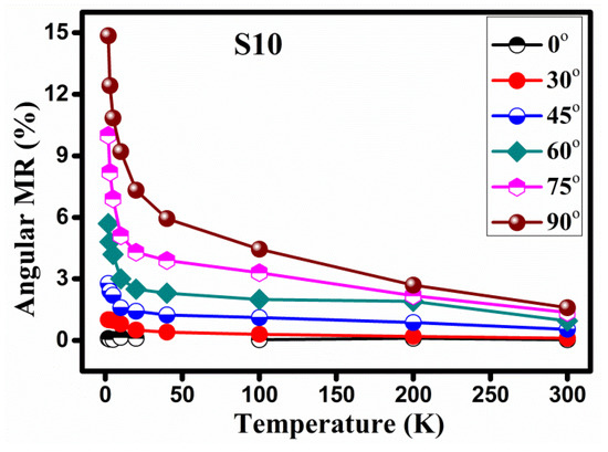Rotating the sample between 0° to 90°, the angular MR magnitude increases, and the highest magnitude was noticed at an angle of 90°, whereas the value of the angular MR decreased from 90°~180°. An inverse relation was observed between the angular MR magnitude for the sample thin film and the measurement temperature, as presented in Figure 5. The plot of the angular MR vs. measurement temperature at different angles presented an exponential decay trend, as seen in Figure 6.
