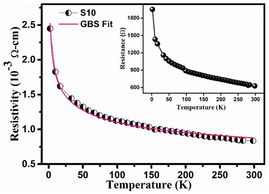 Resistivity vs. temperature for the sample S10 fitted with a GBS conductivity relation; the inset is the RT plot.