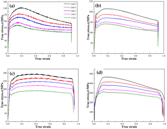 True stress-True strain curves under elevated temperatures and strain rates. (a) ; (b) ; (c) ; (d) .