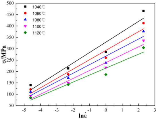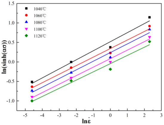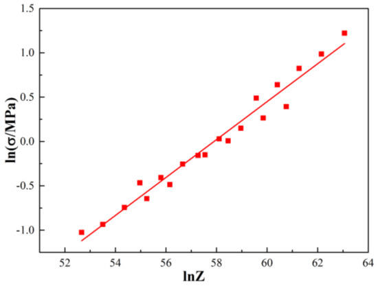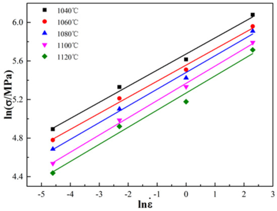 It can be obtained from Equation (6) that there exists a linear relationship between the and when the deformation temperature is a constant. Figure 5 shows the linear relationship of and and the slope of the line is 1/n. From Figure 5, the value of the parameter n can be determined as 4.35.