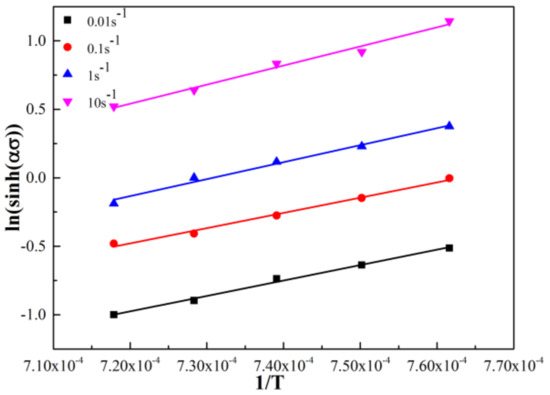 It can be obtained from Equation (7) that there exists a linear relationship between and 1/T when the strain rate is a constant. Figure 6 shows the linear relationship of and 1/T and the slope of the line is Q/nR. From Figure 6, the value of the parameter Q can be determined as 669.7 kJ/mol.