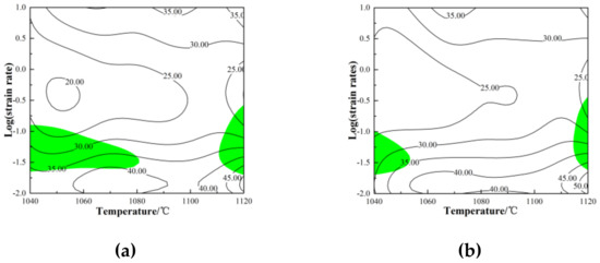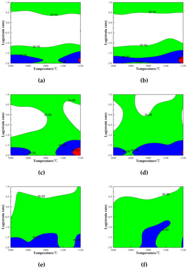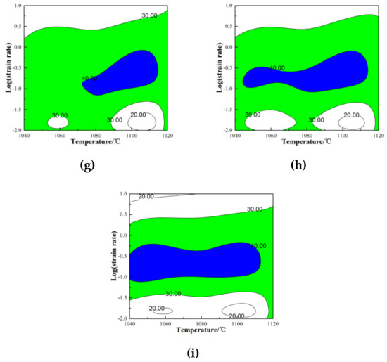Based on the Equation (15), the values of the efficiency of power dissipation were obtained under different temperatures and strain rates and the contour map of the power dissipation were presented in Figure 8 at the strain from 0.1 to 0.9. The green regime corresponds to the power dissipation η ranging from 30 to 40%, the blue and red regimes from 40 to 50% and above 50% respectively, and the white regime corresponds to η < 30%.