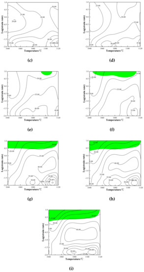 The instability criterion in Equation (16) is also a function of temperature and strain rates. The continuum instability criterion given by Equation (16) demands that the material will exhibit flow instability if the dimensionless parameter is negative. The values at different strains were calculated based on the Equation (16) and the contour maps under the strains of 0.1~0.9 were illustrated in Figure 9. The green domains correspond to the flow instability .