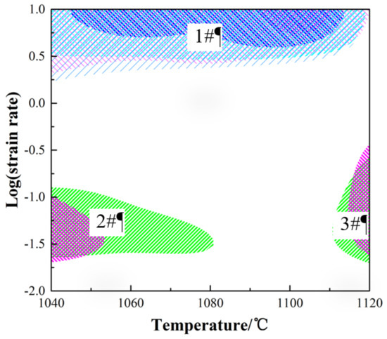 As the hot deformation process is a continuous working process, the flow instability of Waspaloy at different true strains should be considered. Figure 10 illustrates the superimposed processing maps of the flow instability under varying strains. The instability criterion in Equation (16) is also a function of temperature and strain rate. It presents that under the continuous deformation process there are three flow instability domains. The first flow instability regime occurred around 1040–1120 °C/1.5–10 s−1. This means that the high strain rates are not applicable in Waspaloy. The second flow instability regime occurred around 1040–1080 °C/0.02–0.1 s−1. The third flow instability regime occurred around 1110–1120 °C/0.02–0.3 s−1. Thus these flow instability domains should be avoided during deformation process.