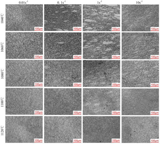 Figure 11 presents the microstructure of the sample under different temperatures and strain rates. It can be seen from the figure that there is much more adequate recrystallization with the increase of temperature, which is consistent with the processing map where the efficiency of power dissipation increases with the increase of temperature. It can be obtained from Figure 10 that there are fully recrystallized microstructures under the strain rates of 0.01, resulting from the fact that the power efficiency η under this deformation state is above 30% at the strain below 0.6. The power efficiency η ranging from 30 to 40% corresponds to the DRX process [38]. Concurrently, the fully recrystallized microstructures occur at the temperature of 1120 °C for the same reasons as the power efficiency η is above 30% where the strain is above 0.3.