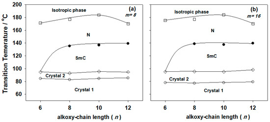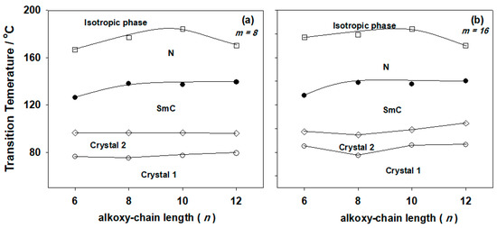 Effect of the alkoxy-chain length (n) of the azopyridine derivatives (IIm) on the mesophase behavior of the 1:1 supramolecular hydrogen-bonded complexes (a) m = 8; (b) m = 16.