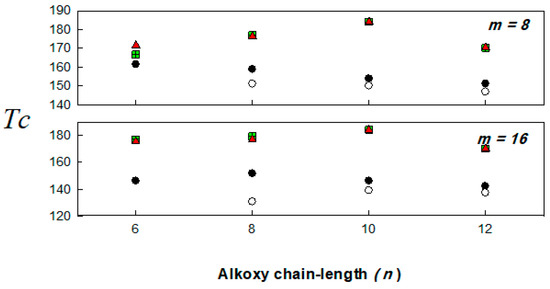 Dependence of the stability temperature (Tc) on the terminal alkoxy chain length (n) substituent of the acid moiety; In/IIm (▲); In/IIIm (■); IVn/IIm (●); IVn/IIIm (○).