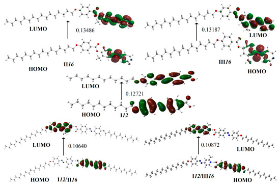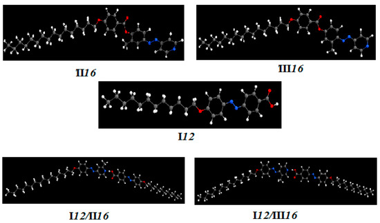 The optimized molecular structure of I12, II16, III16 and their supramolecular H-bonded complexes (I12/II16, I12/III16) were studied in the gas phase using DFT/B3LYP methods using a 6-31G (d,p) basis set by using GAUSSIAN 09W (Figure 5, Table S1–S5). The stability and optimized structure of the compound is confirmed by the absence of imaginary frequency for all of these compounds. As shown in the figure, the calculations predicted the non-linearity of the complexes.
