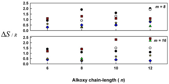 Dependence of entropy change (ΔS/R) on the acid alkoxy chain length (n) of 1:1 supramolecular complexes: Smectic C-to-Nematic transition; In/IIm (●); In/IIIm (○); IVn/IIm (■); IVn/IIIm (▲) and Nematic-to-isotropic liquid transition; In/IIm (◊); In/IIIm (