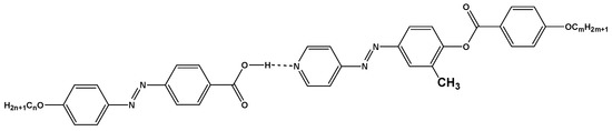 Rod-like liquid crystalline compounds have been intensively studied for technological and scientific important applications such as sensing, optoelectronic display and biologically active materials [1,2,3,4,5]. Mixtures and especially eutectic composition of liquid crystals are very suitable for device applications. It has been reported that substitution in the lateral position decreases the thermal stability of both solid states as well as the mesophase due to the steric effects and the intramolecular hindering of the lateral group [6,7,8,9,10,11,12,13]. Moreover, the computational methods [14,15,16,17,18,19,20,21,22,23,24] have been used as an excellent tool for designing a molecule with projected properties. Many research articles have reported different synthetic methodologies for the preparation of new liquid crystalline materials. Enhanced performance of liquid crystals resulted in the formation of hydrogen bonding (HB) in standard ferroelectric materials [25]. The induction of supramolecular [26,27,28,29,30,31,32] design into liquid crystals (LCs) by the involvement of covalent interactions between different chemical moieties opened a new field of research. Many binary hydrogen-bonded systems, based on derivatives of carboxylic acids as the hydrogen donors and pyridine as an acceptor, have been extensively studied and reviewed [33,34,35,36] Recently, nematic, smectic and columnar mesophases have been induced by hydrogen-bonding between pyridines and benzoic acids [37,38,39,40]. Furthermore, the ability for cis-trans-isomerisation of the azobenzene unite by its irradiation with Ultra violet (UV) light makes it of special interest in many applications. The lengthening of the rigid-rod core of azo-based liquid crystals by the formation of a hydrogen bonding supramolecular complex that may not occur in the individual components highly modifies their properties [41,42]. Moreover, changing the polarity and/or polarizability of both hydrogen bonded components affects the strength of formed hydrogen bond and consequently induces the liquid crystalline character of the interacting components.