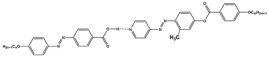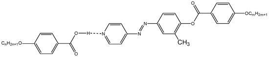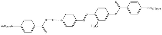 - Naoum, M.M.; Fahmi, A.A.; Mohammady, S.Z.; Abaza, A.H. Effect of lateral substitution on supramolecular liquid crystal associates induced by hydrogen-bonding interactions between 4-(4′-pyridylazo-3-methylphenyl)-4″-alkoxy benzoates and 4-substituted benzoic acids. Liq. Cryst. 2010, 37, 475–486. [Google Scholar] [CrossRef]