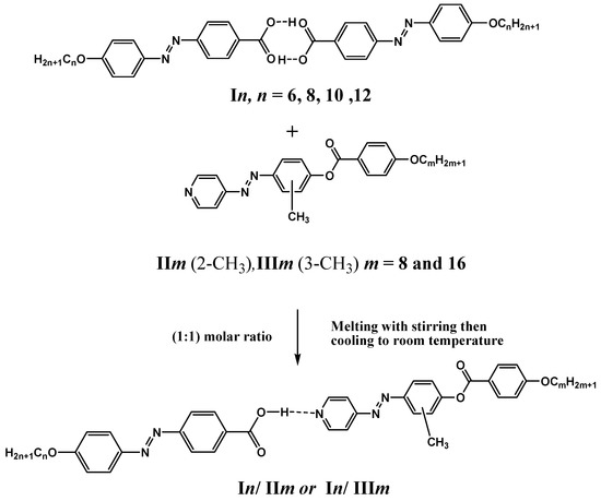 Supramolecular complexes (In/IIm and In/IIIm), in 1:1 molar ratios were prepared by melting the appropriate amounts of each component, stirring to give an intimate blend and then cooling with stirring to room temperature (Scheme 3).