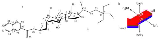 In this paper, we analyze the crystal structure of the iodide salt of a quaternary ammonium derivative of cholic acid having a naphthalene group attached to the 3rd position of the steroid nucleus through an amide bond ([3β,5β,7α,12α]-3-(2-naphthyloylamino)-7,12-dihydroxycholan-24-triethylammonium iodide, 1, Figure 1a). The back (hydrophobic)-belly (hydrophilic), head (naphthyloyl moiety)-tail (quaternary ammonium group) and right-left (where, respectively, lie the O12 and O7 hydroxy groups) structure confers a three-axial chirality to the compound (Figure 1b) [3,19,20]. In addition, to covering the lack of information about these cationic derivatives, here presented results could contribute to the understanding of the supramolecular organization of the compound in an aqueous solution [6], and may be a preliminary step in the study of recognition and binding to receptors of these type of bile acid derivatives. This knowledge gained through the crystal structure can also be useful for the proposition of the structure of the micelles formed in aqueous solutions, a strategy largely followed by Giglio and co-workers [22].