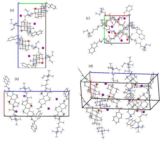 The views of the crystal packing in 1 along the a (a), b (b) and c (c) crystallographic axes. (d) An arbitrary view that allows for the reflectance of relevant distances and interactions involving the iodide ion (see text).