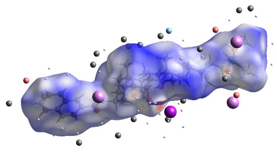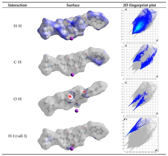 Table 4 resumes the relative contributions to the Hirshfeld surface area for the various close intermolecular contacts in 1, H…H being the most common one since it represents 75% of the total Hirshfeld surface area. This value is logically lower than the observed in a cholest-5-ene crystal (=98.6%), where only the C-C and C-H bonds exist [46]. The percentage of O…H interactions (hydrogen bonds) is 6.5%. This value is equal to the sum of 3.4% and 3.1% since contributions of the atoms being inside or outside the surface have to be taken into consideration. Iodide (outside) only interacts with hydrogen, with the percentage being 4.8%. Therefore, the molecules are linked by a combination of strong (electrostatic and hydrogen bonds) interactions and weak (H...H and C...H) interactions.