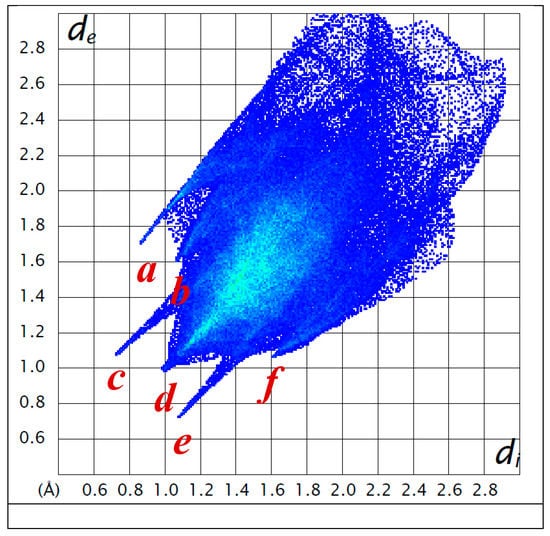 Molecular Hirshfeld surfaces visualize the intermolecular interactions in a crystal in a visual manner [43]. Two distances, de and di, mapped on the Hirshfeld surface, provide the three-dimensional picture of intermolecular close contacts in the crystal [44]. Here, di is the distance from the surface to the nearest atom interior of the surface, and de is the distance from the surface to the nearest atom exterior of the surface. Both are used to generate a two-dimensional plot (fingerprint plot) which is a summary of the intermolecular interactions in the crystal. Thus, while the Hirshfeld surface and properties defined by it emphasize a whole-of-molecule approach to understanding intermolecular interactions, they can also be used in conjunction with a more direct atom–atom based approach to gain a complete appreciation of the important interactions in a molecular crystal.