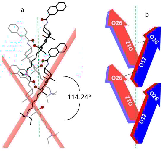 According to Miyata et al. [50], crystals possessing 21 helical axes may be considered as formed by bundles of helixes with a given handedness. To determine this spatial tendency around the 21 symmetry element, one must focus one’s attention on the long molecular axis (tail-head) of the molecules with their bellies pointing to the axis. This arrangement appears in cholic and deoxycholic acids [50], both exhibiting right-handedness. However, this is not the case for 1 because the hydrogen bonds that take place cause the connected steroid molecules to adopt another spatial disposition. To resolve the problem of situations like this, an additional criterion was stablished [25] and, according to it, the steroid skeleton must be exposing its right side towards the 21 axis. Figure 7 is constructed by taking into account this criterion and from it, right-handedness is deduced. The measured value for the angle between the horizontal planes of two consecutive molecules used to define the handedness of a helix allows for the determination of the pitch and the tilt in the helical arrangement around the screw axis [25]. The application of this strategy in 1 affords a pitch angle of 57.1° and a tilt of 32.9°.