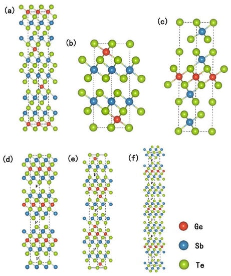 Structures for mGeTe•nSb2Te3 phases: (a) stable Ge1Sb2Te4, (b) stable Ge2Sb2Te5, (c) stable Ge1Sb4Te7, (d) meta-stable Ge1Sb2Te4, (e) meta-stable Ge2Sb2Te5, (f) meta-stable Ge1Sb4Te7, v represents a vacancy layer. The Ge (red balls), Sb (blue balls), and Te (green balls) are indicated.