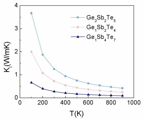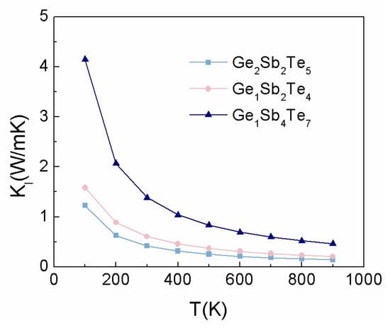For meta-stable rock-salt-like GST phases, although the atomic stacking sequence is similar with the hexagonal phases, the thermal transport behavior is quite different. The lattice thermal conductivity of the rock-salt like phases is plotted in Figure 5. It is seen that the kl of GST147 is much lower than that of the GST124 and GST225, opposite to the trend observed in the hexagonal phases. This might be due to the fact that there is a vacancy layer between two adjacent Te atomic layers instead of van der Waals bonding. As we know, the defects in the crystal will increase the phonon scattering, and thus reduce the thermal conductivity. In mGeTe•nSb2Te3 chalcogenides, when the n/m ratio increases, the vacancy concentration increases. For the GST147, GST124, and GST225, the vacancy concentrations are 28.6%, 25%, and 20%, respectively. The real meta-stable system is more complicated than our ideal model, therefore the vacancy ordering in these compounds will change when the samples are annealed under different conditions, hence resulting in large differences in thermal conductivity [32]. Nevertheless, although the calculated lattice thermal conductivity of rock-salt-like GST is overestimated, the observed relationship of lattice thermal conductivity for GST as a function of the n/m ratio is very useful. According to this relationship, one can estimate the possible trend of the lattice thermal conductivity for other GST compounds. For example, the lattice thermal conductivity of Ge3Sb2Te6 is assumed to be larger than GST225, as the latter possesses more vacancy, which agrees well with the experimental observation [32].