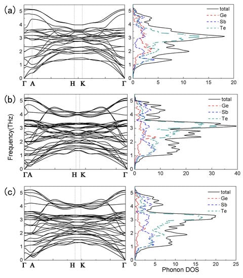 Phonon dispersion relations and phonon density of states for hexagonal GST compounds: (a) GST225, (b) GST124, and (c) GST147.