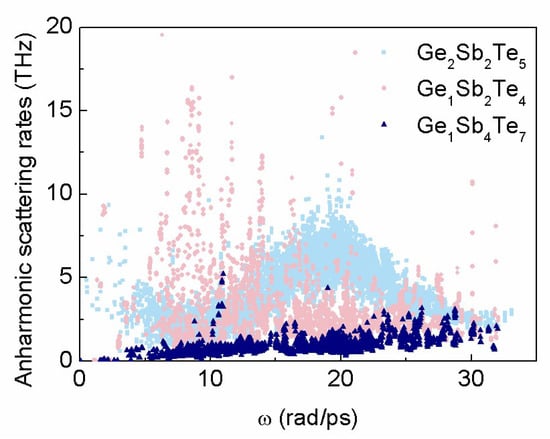 To gain more insight into the observed thermal transport behavior, we have investigated the anharmonic scattering rates of h-GST phases at room temperature, as plotted in Figure 4. It is apparent that the anharmonic scattering rates of GST147 are the lowest, followed by GST124, and then GST225, indicating that the phonon lifetimes decrease in the sequence of GST147, GST124, and GST225. Based on this phonon-lifetime behavior of GST, it is easy to understand the above trend of the lattice thermal conductivity of mGeTe•nSb2Te3. Finally, it is seen that the anharmonic scattering rate of GST147 is much lower than that of GST124 and GST225, which is the physical origin of the much larger lattice thermal conductivity of GST147. This could be due to the fact that GST147 has a greater number of Te-Te weak bonds [41].