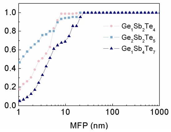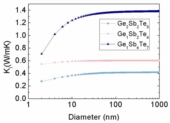 Many materials, such as Si [42], usually show a strong size-dependent thermal conductivity. Since the GST chalcogenides have been shown to scale down to very small dimensions [43], it is interesting to see how size effect will influence the lattice thermal conductivity. Figure 6 plots the kl of h-GST nanowires along the out of plane direction with different diameters. The construction of the nanowire and theory model is formulated in reference [27]. This method was successfully used [44]. Interestingly, the lattice thermal conductivity of GST chalcogenides shows a small size dependence. For nanowires with a diameter larger than 100 nm, the kl is almost the same as that of the bulk phase. For GST124 and GST225, it is observed that the kl decreases obviously only when the diameter is reduced down to 10 nm. In order to have a clear comparison for these three compounds, the normalized cumulative thermal conductivity for GST124, GST225, and GST147 is shown in Figure 6. It is interesting to see that the GST chalcogenides are more sensitive to size effect when the n/m ratio increases. For mGeTe•nSb2Te3 chalcogenides, the phonon mean-free path (MFP) increases with the increasing n/m ratio. It is known that nanocrystallization could reduce the thermal conductivity owing to the boundary effect, as the phonons with larger MFPs than the boundary would be easily blocked. Therefore, due to the small MFPs of GST phases, it is not easy to reduce the thermal conductivity by reducing the size, as shown in Figure 7.