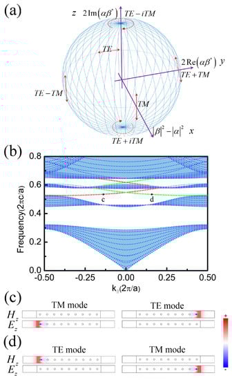 Bloch sphere and energy band of supercell. (a) Choose , , and of the two-component vector , e.g., , , to be the x-, y-, and z-components of 3D space. The polarizations transverse electric (TE)/transverse magnetic (TM), TE + TM/TE − TM, and TE + iTM/TE − iTM are the unit vectors on three main axes. (b) The projected band structures of the photonic topological insulator (PTI). Gapless edge states are denoted by green and red dotted lines. (c) and (d) correspond to the field (both electric and magnetic) distribution of points c and d in Figure 1b, respectively. The color represents the value of the or .