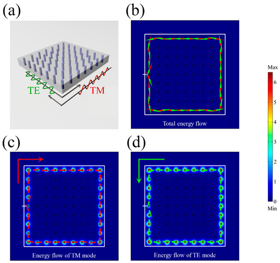 Energy flow of a “ring-shaped” structure. (a) A schematic of the total energy flow in a ring-shaped PTI. (b) The net zero energy flow for the TE and TM modes combined. (c) The clockwise propagating energy flow of the TM mode. (d) The anti-clockwise propagating energy flow of the TE mode. The white bar represents the excitation source. The color on site represents the amplitude of the energy flow. Red (green) arrows represent the flow direction of the TM (TE) mode.