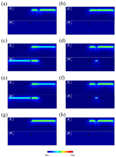 Figure 1b shows the projected band structures of the proposed PTI, in which the blue dotted lines represent the degenerate bulk states (shadow region) while the green and red dotted lines between the second and the third energy bands represent the two edge states for the TE and TM modes. Figure 1c,d are the field distribution of point c and d marked in Figure 1b, respectively. The edge states are analyzed and confirmed in a three-layer sandwiched waveguide configuration. Its cladding/boundary layer has parameters and , which satisfies pseudo TRS and confines the light traveling along the waveguide-cladding interface [15,31,32]. At the frequency corresponding to point c, localized electric (magnetic) field distribution at the left (right) interface suggests that the left (right) interface only supports the TM (TE) mode. The dispersion curve’s slope is always positive in this case, indicating the light travels in a forward direction. On the other hand, the properties at point d are completely reversed. Therefore, only clockwise (anti-clockwise) scattering for the TM (TE) wave is allowed to travel along the boundary. The one-way propagating condition is the opposite for the edge states in the third gap. It is worth noting that other types of boundaries can also be used, such as a photonic crystal-air interface [32,33].