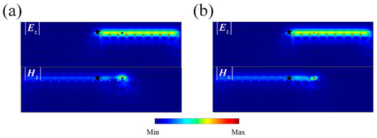 Field distribution with mixed impurities. We mixed impurities with character Hamiltonians and with . Field distribution with impurities (a) and (b) . It can be seen that by exchanging TE and TM modes, and .