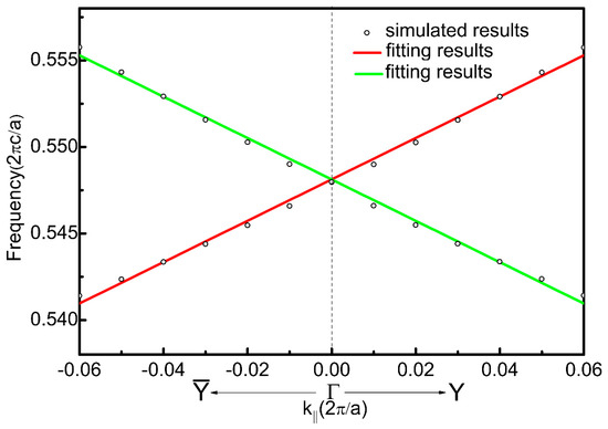 Here, we apply the tight binding approximation method to construct an analytical model via the low-energy effective Hamiltonian. For simplicity, TE and TM polarization can be treated independently. For the TE polarization, there are three types of eigen-modes, these being , , and , equivalent to an electric monopole and two electric dipole modes in an electronic system. We can define new modes as the linear superposition of and : . By applying the perturbation theory and expanding the k-dependent Hamiltonian to the first order, we can obtain [26]