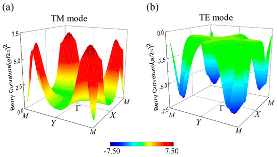 with the result shown in Figure 6a. The corresponding spin Chern number can be calculated by integration of the BC over the whole Brillouin zone . The BC around the M points has positive values and contributes most to the summation, leading to . On the contrary, the BC of TE polarization is negative near the M points as shown in Figure 6b, and the corresponding spin Chern number . The final result further indicates the photonic QSHE appearing in our system [11]. It can be shown that the invariant and spin Chern number yield equivalent descriptions [26,34].