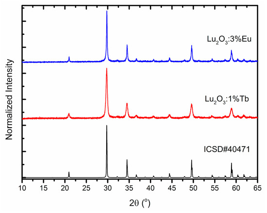 XRD patterns of the Lu2O3:Eu and Lu2O3:Tb powders and the simulated one for cubic Lu2O3 [3].