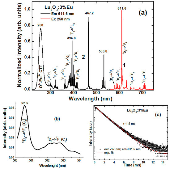 The excitation spectrum of the Eu3+ 611.6 nm luminescence (C2 site) of Lu2O3:Eu NP (Figure 5a, curve 2) consisted of sharp lines in the 270–550 nm range, corresponding to the intrinsic 4f–4f transitions of Eu3+ ions. Narrow, well-resolved excitation lines again attested to the high structural quality of the fabricated Lu2O3:Eu NPs. A strong wide excitation band peaking at approximately 260 nm was related to the O2−→Eu3+ charge transfer transitions (CTT). One might be surprised by the high intensity of the 4f→4f excitation transitions of Eu3+ compared to its CTT band. This was already explained years ago [19] for Lu2O3:Eu and even earlier [20] for electronic and vibronic transitions of Pr3+ in other compositions as resulting from the saturation effect which effectively suppresses the measured intensity of the CCT. This occurs because the very high absorption co-efficient of the charge transfer transitions precludes excitation of the whole depth of the phosphor layer, while much lower absorptivity due to 4f→4f transitions allows the deeper penetration of the sample by radiation in the area of their occurrence.