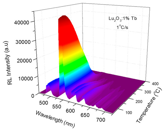 Radioluminescence: The temperature dependence of the RL spectra of Lu2O3:Tb NPs was measured up to 500 °C (Figure 11). As can be seen from this figure, the Tb3+ luminescence disappeared at about 400 °C. This resulted from a thermal quenching which was reported for Lu2O3:Tb sintered ceramics to start right at room temperature [27]. Note that in this experiment, the dependence of RL intensity on temperature was to some extent distorted by the appearance of TL photons which contributed quite significantly in the range of ~50–150 K (see Figure 10a).
