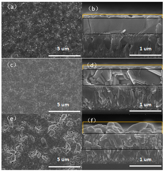 In this study, the impact of the delay time before annealing on the MAI-PbI2-DMSO intermediate phase on the perovskite solar cells’ films was investigated. Perovskite films with different delay times after the spin-coating of MAI precursor solution, viewed by SEM, are shown in Figure 1. Figure 1a,c,e show the surfaces made with the delay times of 0 s, 5 s, and 10 s. Figure 1b,d,f are cross-sectional views of the 0 s, 5 s, and 10 s films. From Figure 1a, when the delay time is 0 s, the crystal grains of the perovskite are uniform and the grain size is about 400 nm. The perovskite film is dense, without pin-holes and cracks. The cross-section depicted in Figure 1b shows that the thickness of the 0 s perovskite film is very uniform and the film thickness is about 400 nm. We then adjusted the delay from 0 s to 5 s. Thereafter, as shown in Figure 1c, the grain size of the perovskite film is not uniform and the grain boundary is not obvious, so the single grains cannot be distinguished accurately. From the cross-section of Figure 1d, it can be seen that the phenomenon of stacking of perovskite single crystals appeared and the film thickness of about 400 nm consists of many small perovskite crystal particles. In addition, Figure 1e shows that the flatness and uniformity of the film made with the 10 s delay time are significantly worse than the flatness and uniformity of the 5 s film. The surface of the film has large pin-holes, small crystal grains and irregular growth. From Figure 1f—the cross-sectional view—we see that these protrusions actually grow some irregular crystal particles on the top surface of some crystals, resulting in a partial or even multi-layer crystal on the surface of the film, therefore the surface of the film is uneven. According to the above analysis, we conclude that the quality of the film deteriorates with the extension of the delay time before annealing.